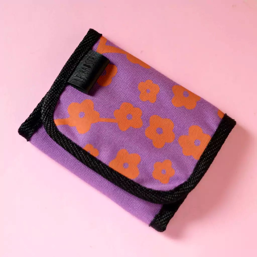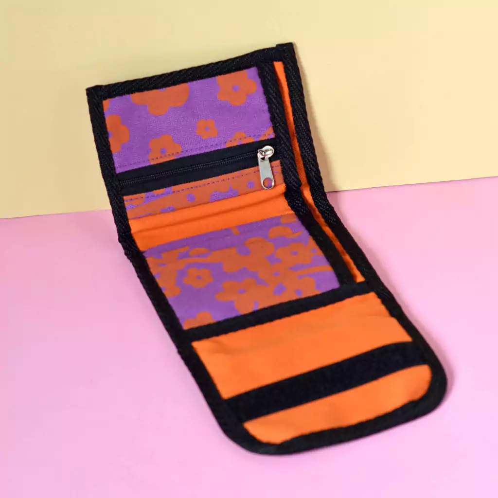 Billetera tríptica corta de lona lisa y estampada. Cierre con velcro. Interior forrado con tela del mismo material. Monedero con cierre.
